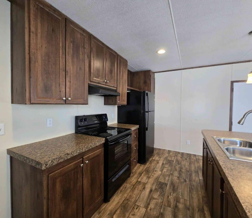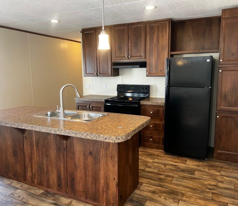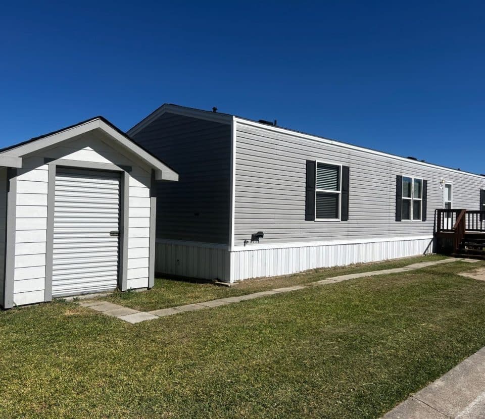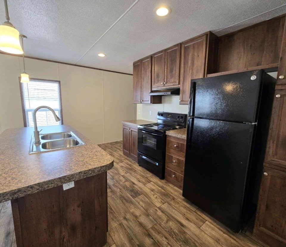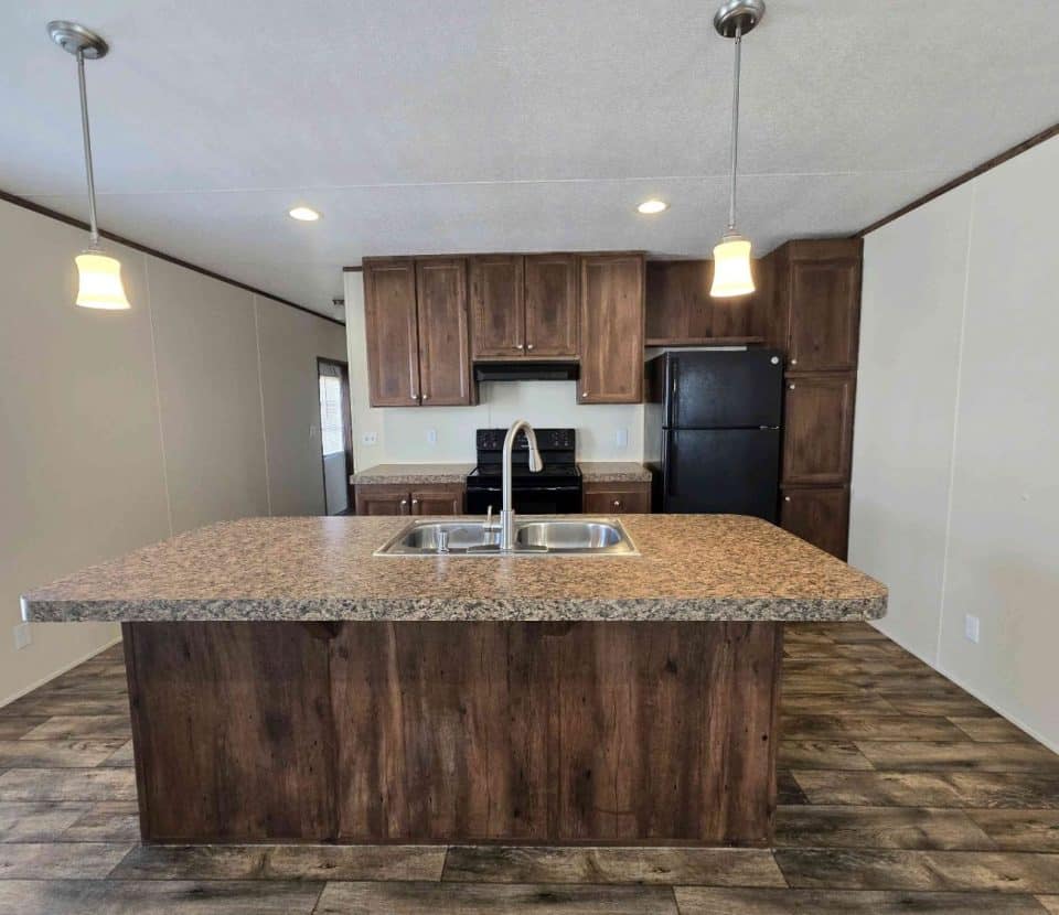 The kitchen features plenty of cabinet space, a large island, and all major appliances included. The home includes washer and dryer connections, front and rear decks, and a private driveway for easy parking. A storage shed outside provides additional space for tools and personal items.